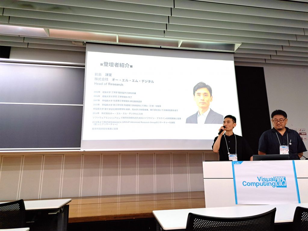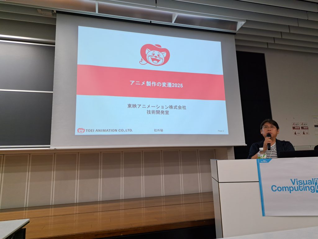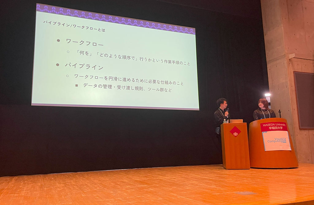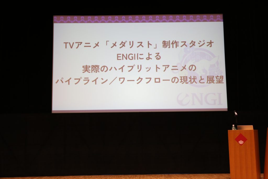 筆者は、CG-ARTSの会員企業でもある株式会社ENGIさんの特別講演「TVアニメ「メダリスト」制作スタジオENGIによる実際のハイブリットアニメのパイプライン/ワークフローの現状と展望」を聴講したので、その内容もご紹介します。テクニカルスーパーバイザーの帆苅哲氏と、ラインプロデューサーの萩原恭香氏が登壇されました。