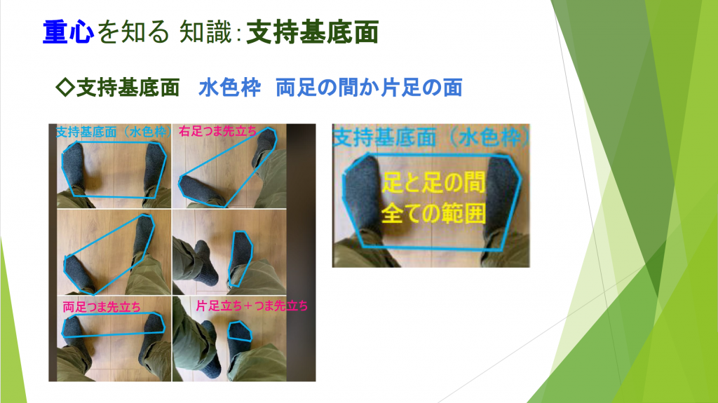 講義で学んだ「支持基底面」や「重心ライン」が、本当に身体のバランスに影響しているのか、実際に体を動かして観察しました。