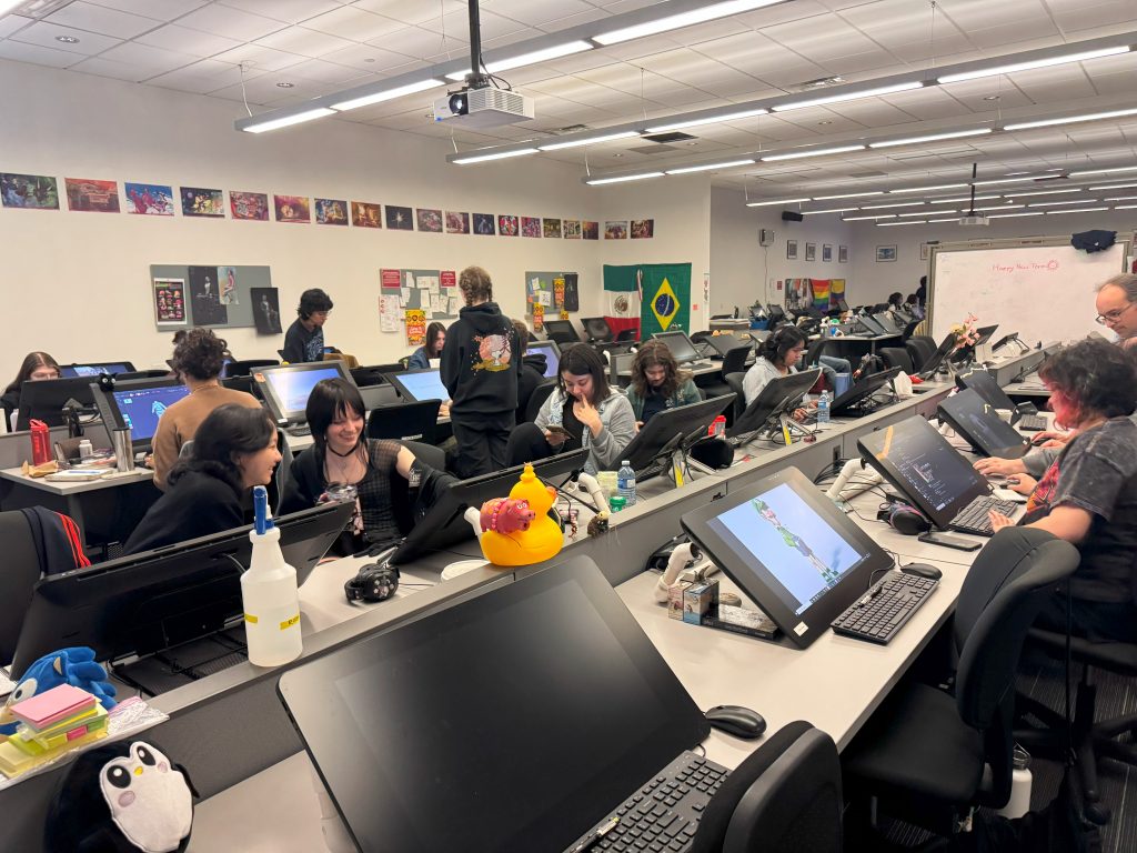 各学生のデスクには、日本のアニメやゲームのキャラクターグッズが数多く並び、日本発のコンテンツが世界のクリエイターたちに多大な影響を与えていることを肌で感じることができました。2Dゲーム制作ではUnityを使用した開発も盛んで、前述のGame Designコースとの共同制作も数多く行われており、実践的かつ効率的なカリキュラム構成がよく理解できました。