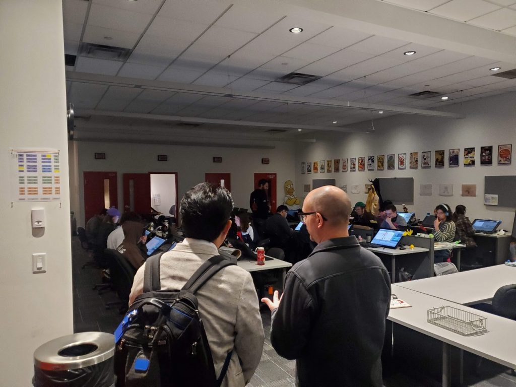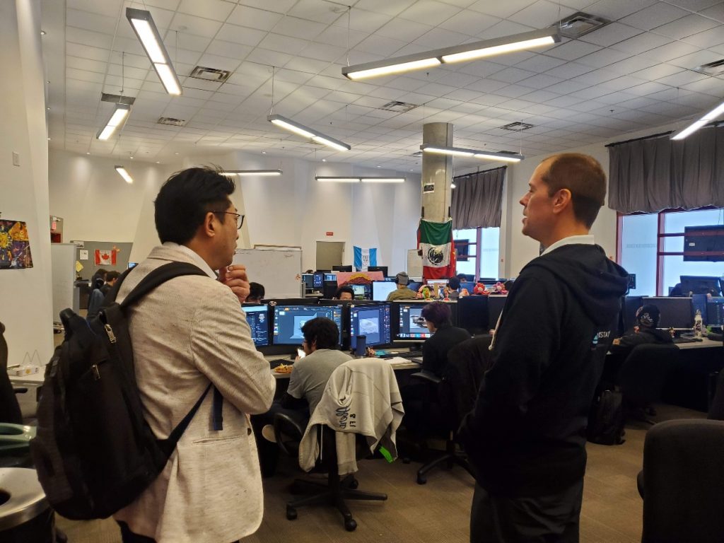 同コースは、カナダ国内の「ゲームデザインスクールランキング」において、2025年度に5度目の第1位を獲得するなど、非常に高い評価を得ています。現地では、3D Animation + Visual EffectsコースとGame Designコースの学生が合同でチーム制作を行うPBL(課題解決型学習)が盛んに推進されており、互いの専門性を活かした実践的な開発環境が整っていることが強く感じられました。