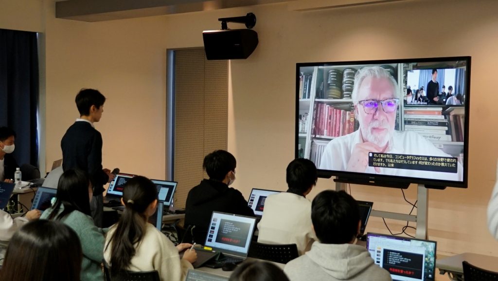 授業当日は、日本特有のアニメ制作技法を学ぼうとする学生たちの熱意が画面越しにも伝わり、食い入るように講義へ集中する様子が大変印象的でした。